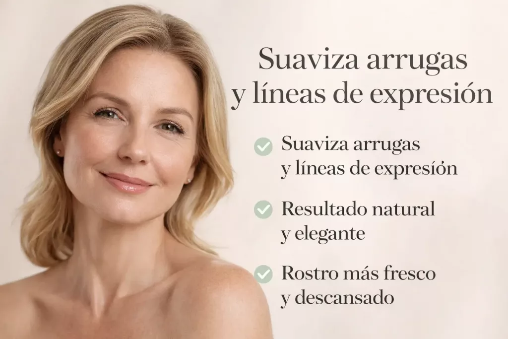 Ayuda a suavizar arrugas dinámicas en zonas como frente, entrecejo y patas de gallo, logrando una apariencia más lisa y descansada.