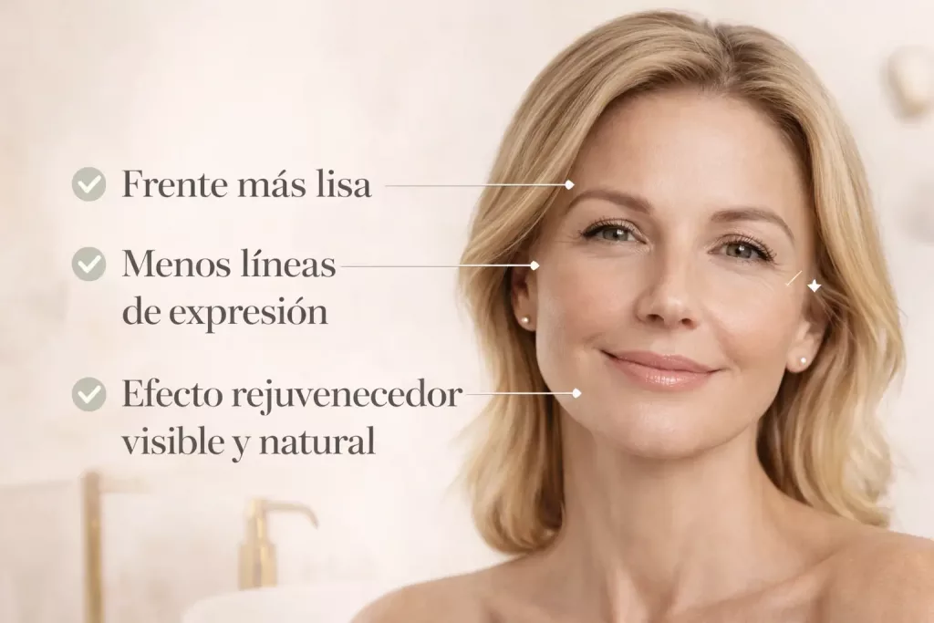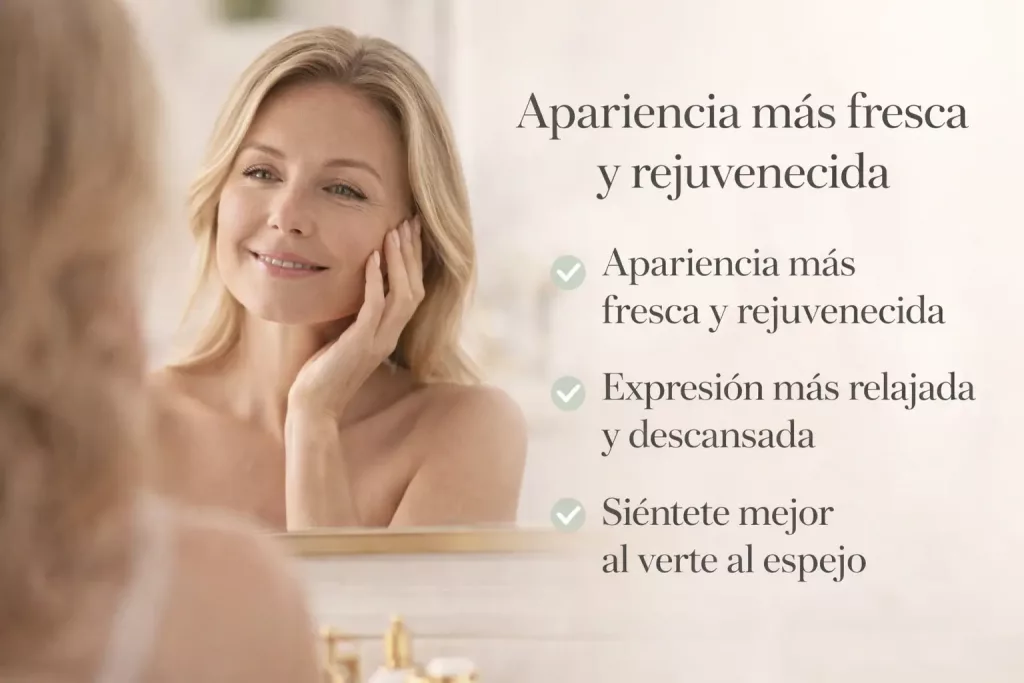 Su principal función es suavizar líneas de expresión y mejorar la armonía del rostro, pero muchas personas también perciben una apariencia más fresca, descansada y rejuvenecida.