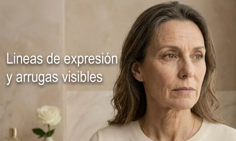 Principalmente arrugas dinámicas o líneas de expresión asociadas a la gesticulación, especialmente en frente, entrecejo y patas de gallo.